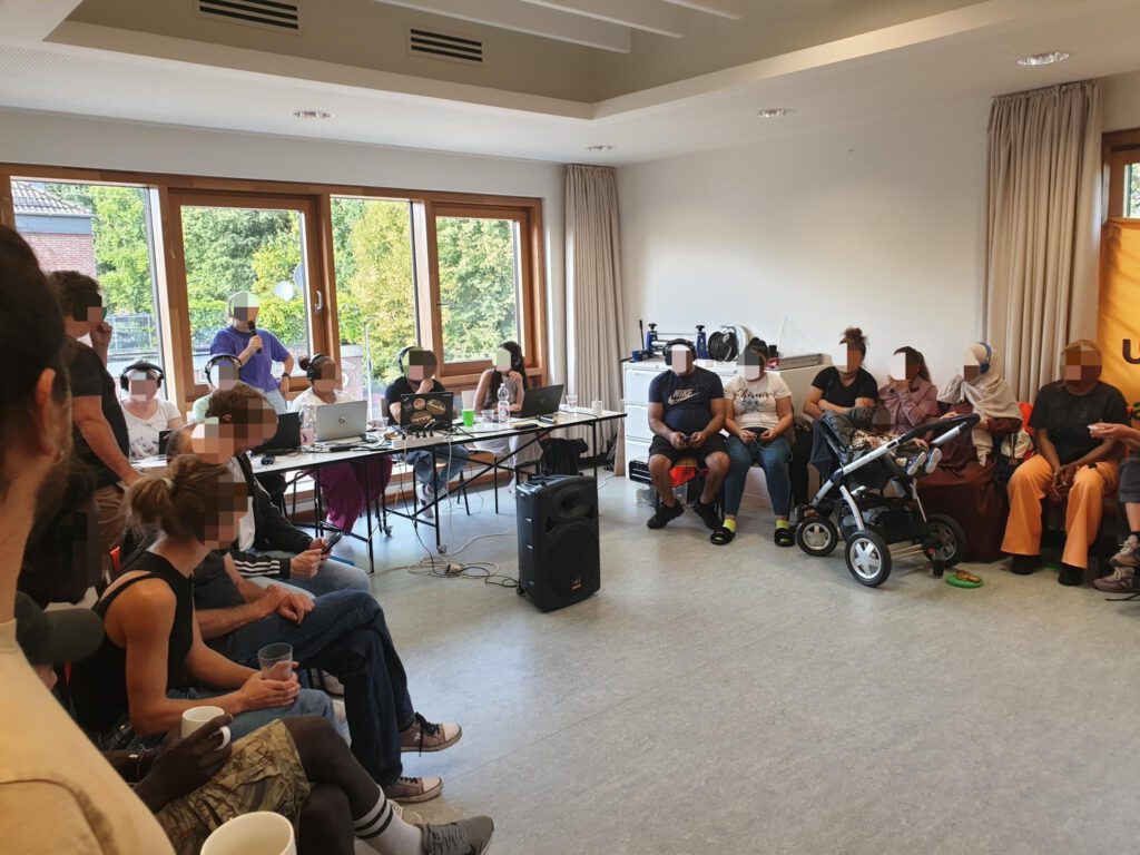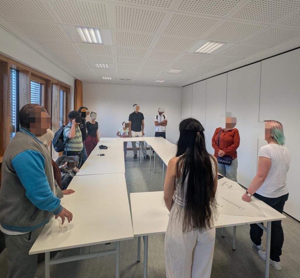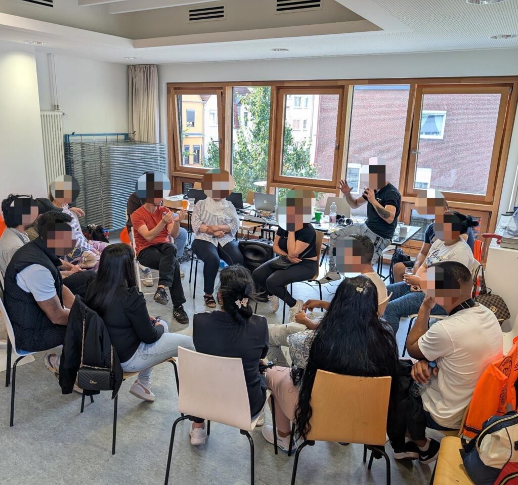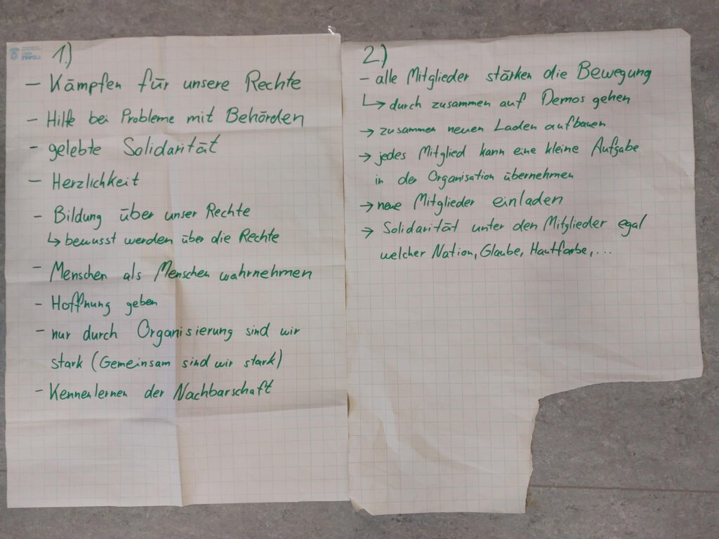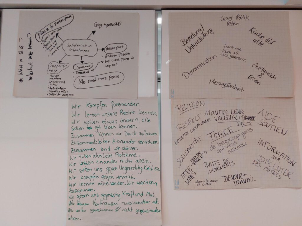 In fünf Kleingruppen mit jeweils unterschiedlichen Sprachen (bulgarisch/türkisch, englisch, französisch, arabisch und deutsch) haben wir über die Frage diskutiert und die Ergebnisse später in der großen Versammlung vorgestellt. Dabei ist klar geworden, dass viele Mitglieder ein ähnliches Bild von Solidarisch in Gröpelingen und sich über die Zeit ein gemeinsames Verständnis darüber entwickelt, was SiG ist. Wichtig war auch, dass wir uns als Mitglieder nochmal darüber bewusst geworden sind, was uns von einer Beratungsstelle unterscheidet.